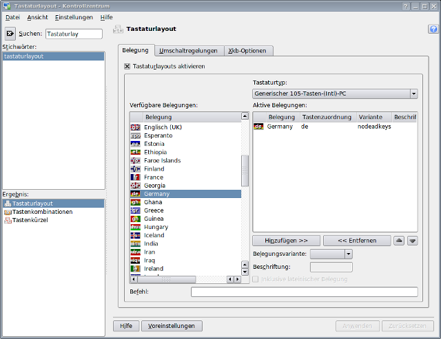 In der /etc/X11/xorg.conf habe ich die Section "InputDevice" für mouse und kbd / keyboard entfernt. und in der Section "ServerLayout" habe ich die beiden InputDevice "Mouse" "CorePointer" und InputDevice "Keyboard" "CoreKeyboard" auch entfernt. Danach hatte ich immer noch eine Englische Tastatur. Kurz gegoogled und dann erfahren das man jetzt das Tastaturlayout über den Windowmanager anschalten soll. Also das KDE-Kontrollzentrum gestartet, darin nach Tastaturlayout suchen und dort einstellen wir im Bild zu sehen.